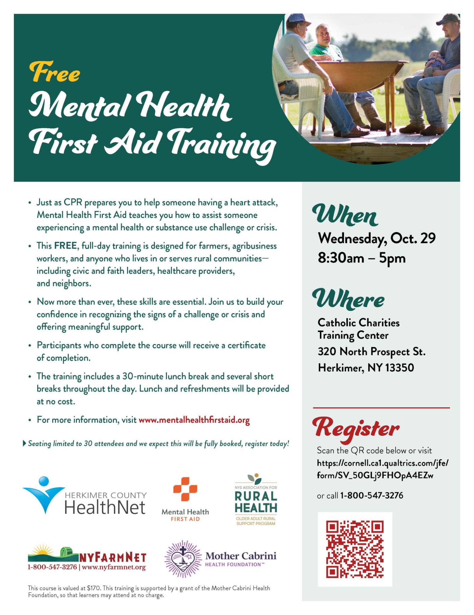 Mental Health First Aid Training Back to Search Mental Health First Aid Training Wednesday, October 29, 2025 (8:30 AM - 5:00 PM) (EDT) Description Additional Info × Catholic Charities Training Center 320 North Prospect Street Herkimer, NY 13350 United States Wednesday, October 29, 2025 (8:30 AM - 5:00 PM) (EDT) Registered Guests × Share × Print Email Add to Calendar Facebook LinkedIn X Pinterest Powered By GrowthZone