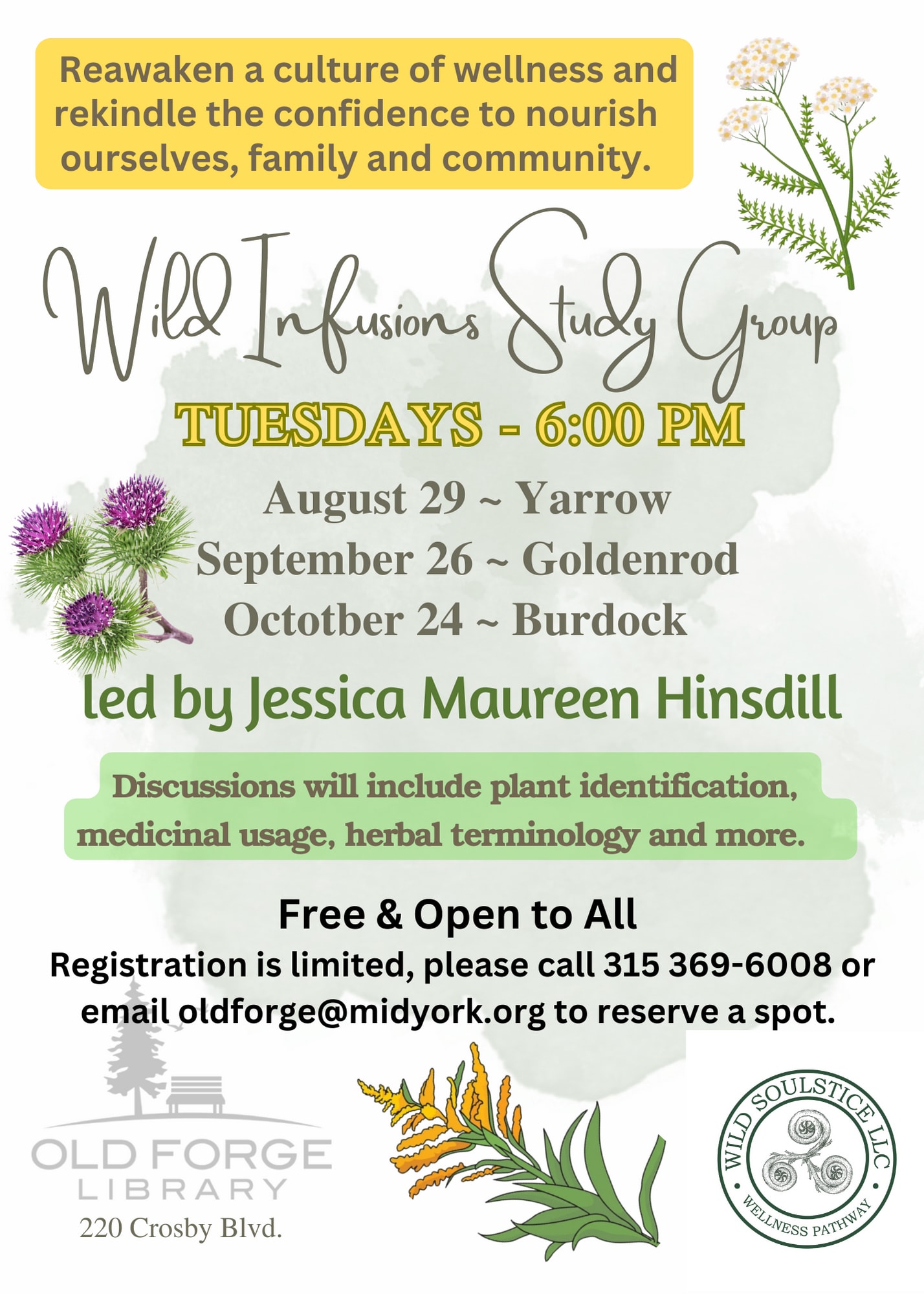 Due to the popularity of the summer sessions of Wild Infusions Herbal Study, the Old Forge Library wiill be hosting Jessica Maureen Hinsdill of Wild Soulstice, LLC with Fall sessions of the study group.The remaining fall sessions will be held on Tuesdays September 26 and October 24 at 6 pm.