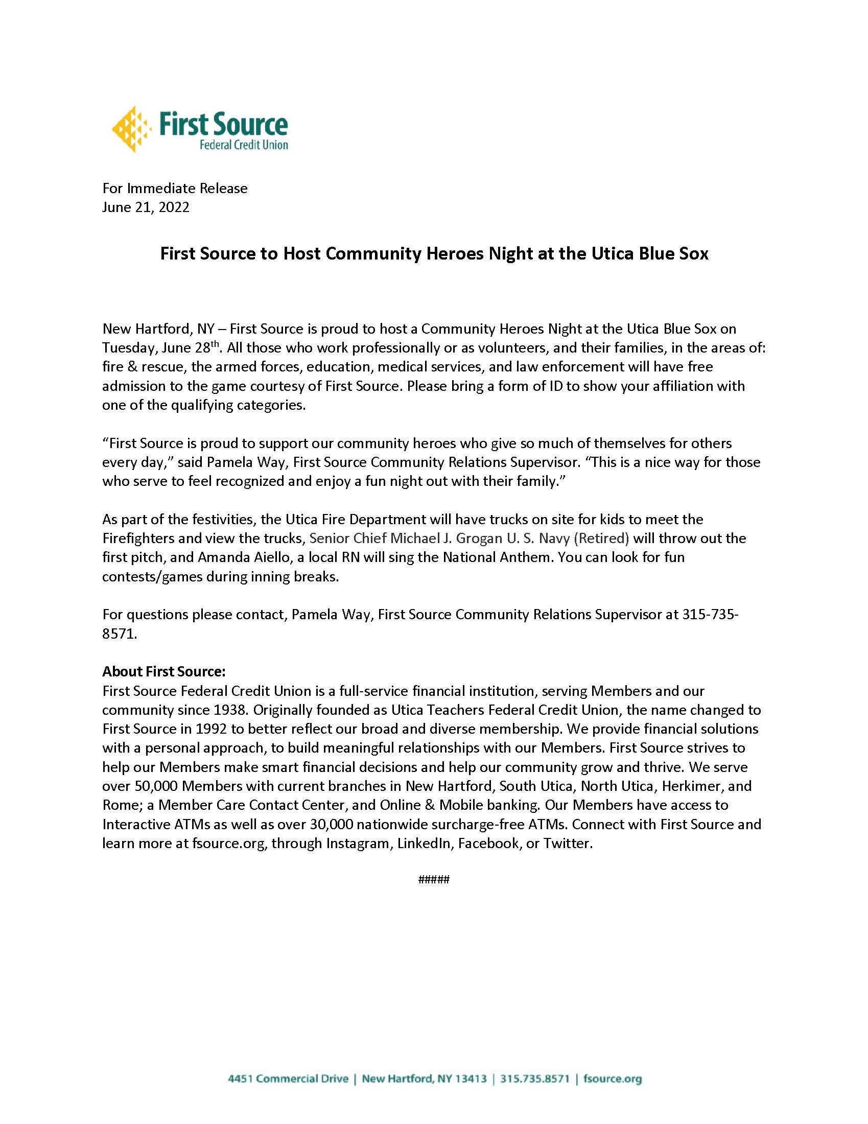 First Source to Host Community Heroes Night at the Utica Blue Sox Back to News Items First Source to Host Community Heroes Night at the Utica Blue Sox By Herkimer County Chamber of Commerce 6/22/2022 Images Images × Share × Email Facebook LinkedIn X Pinterest Powered By GrowthZone